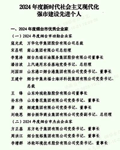 日前,中共煙臺市委、煙臺市人民政府公布了2024年度煙臺市優(yōu)秀企業(yè)家名單,集團公司唐波董事長榮獲“2024年度煙臺市功勛企業(yè)家”稱號。